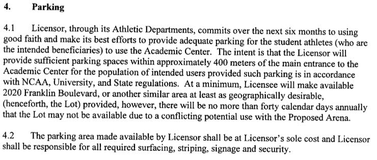 Back when Frohnmayer and Melinda Grier “negotiated” with Slusher for parking for the Jock Box, we lost something like 120 parking spots. We just gave them to the athletic side gratis, and paid for new ones by increasing general parking fees. Of course, Frohnmayer did get a $150,000 bonus that year from some anonymous donor.