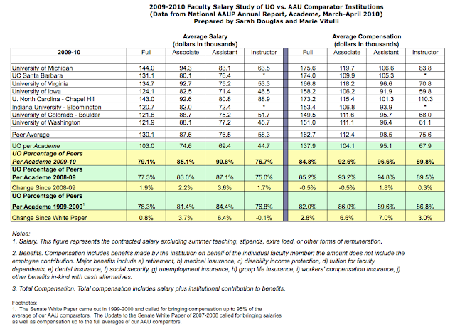 4/20/2011: From Sarah Douglas and Marie Vitulli at UO’s AAUP chapter. Also see the AAUP/AFT faulty union website and the Bunsis analysis of UO finances. President Lariviere’s compensation details are here. He is in the top 22nd percentile of public research schools. Don’t get me started on the Chancellor. Stories by Stefan Verbano in the ODE and Bill Graves in the Oregonian – this with many interesting comments.