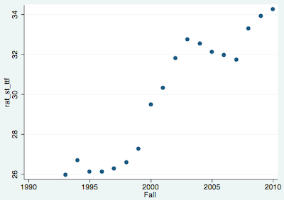 That’s not going to happen – our provosts have already spent too much money on guns, lawyers, their Johnson Hall renovations, raises, sabbaticals, cars, and sports junkets and subsidies. Here’s the plot of the number of students per TTF, through fall 2010:
