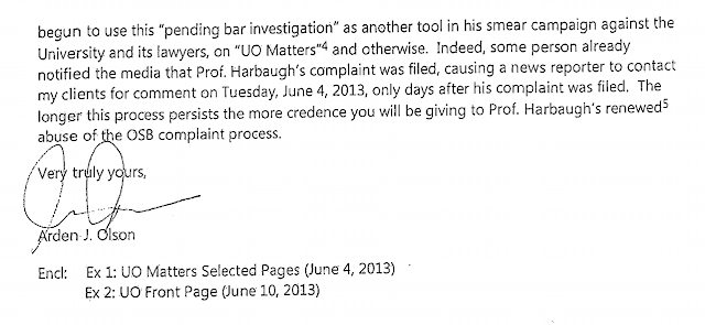 Arden J. Olsen’s accusation of a “…smear campaign against the University…” of Oregon by UO Matters is laughable. I’m no lawyer, so I dare not call it ‘libelous’, but it sure is nasty and appears to be false. I detect no doubt among UO Faculty that UO Matters is engaged in a conscientious effort to promote open, honest administration of our University.