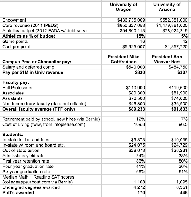 The UA plans are considerably more complex than Bernie reports. Among other things, retirees can take credit for sick leave, which UO does not allow. The state also has a defined benefits plan, with a subsidy for employees after 5 years, etc. See http://www.hr.arizona.edu/files/2013ORP_GuideFInal.pdf